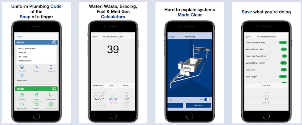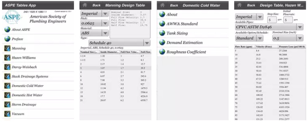 Plumbing Systems Design Tables is a tool that provides all the equations, pipe sizing data, and background information plumbers can use to create plumbing system designs. The data and information within the app were taken from major plumbing codes and standards used throughout the U.S., and makes it easier for plumbers to “calculate pipe flow rates and velocities, friction loss, pressure loss, and stack flow rates.”