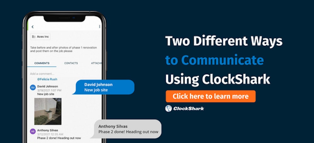ClockShark helps teams stay on the same page with in-app communication through notes and conversations (a chat platform for a specific job or customer). Send notes with specific instructions for employees to see when they clock in for a shift. Read the notes employees leave about a shift after they clock out or throughout the day. With conversations, you can chat with employees in real time and the conversation attaches to a specific job or customer for quick reference. Read our guide to communication in ClockShark to learn more.